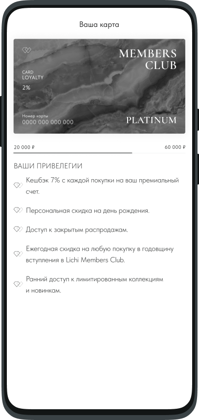 Зарегистрированным участникам Lichi Members Club открывается доступ к широкому кругу привилегий. Мы создаем наилучшие условия для комфортного и эффективного шопинга, поэтому подбираем персональные предложения и формируем уникальную связь между брендом и Покупателем.