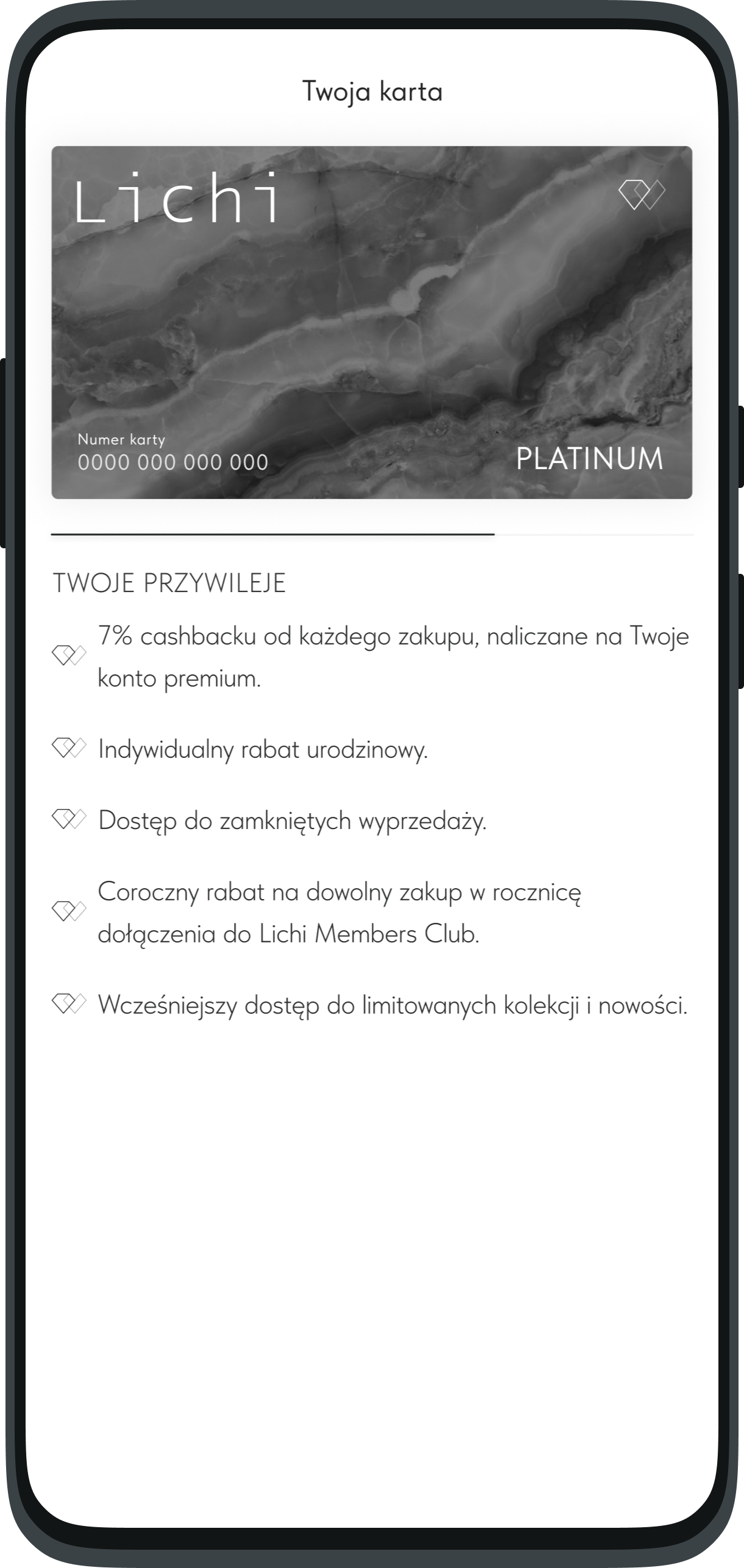 Swój status można sprawdzić w koncie osobistym na stronie internetowej www.lichi.com oraz w aplikacji mobilnej w sekcji Lichi Members Club. Możesz również zawsze sprawdzić swój status w oficjalnych sklepach marki przy pomocy pracowników.